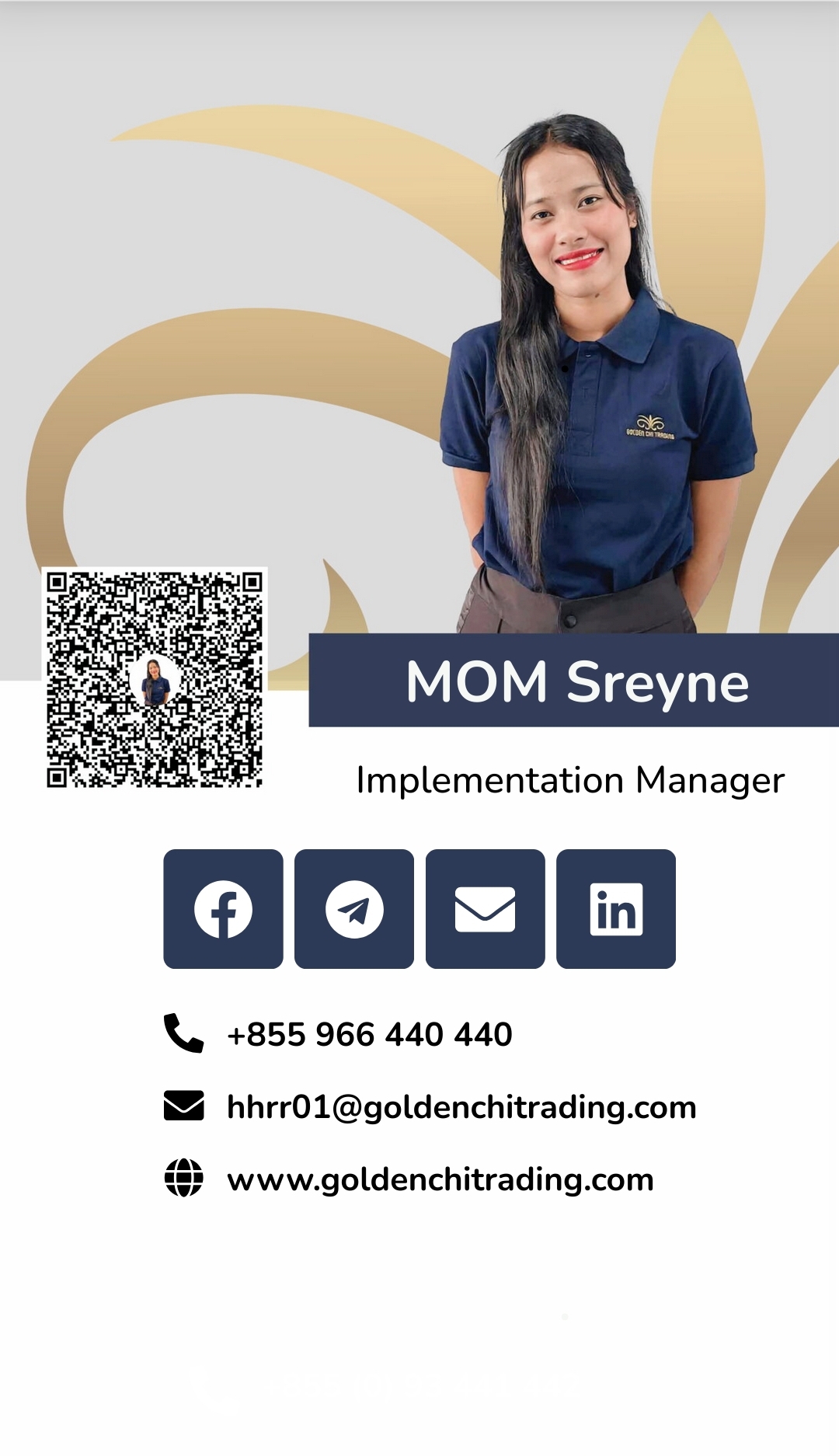 . . MOM Sreyne Implementation Manager Facebook Telegram Envelope Linkedin +855 966 440 440 hhrr01@goldenchitrading.com www.goldenchitrading.com . +855 (0) 93 441 442 Save Contacts . . .